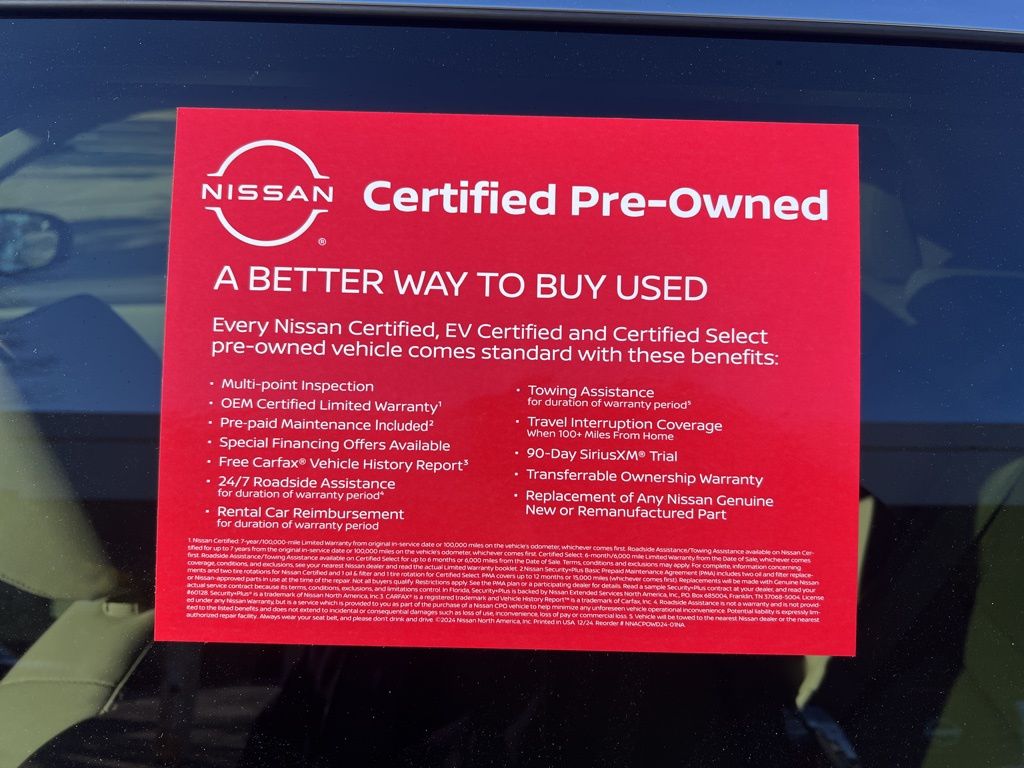 * 7 Year/100,000 Mile Limited Warranty, 24/7 Hour Roadside Assistance, Carfax Vehicle History Report, Plus 1 Year Pre-Paid Maintenance Included. Gas Powered Nissan Models Only.