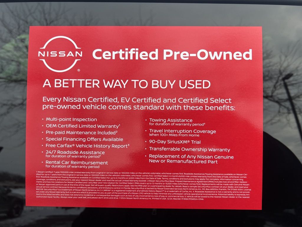 * 7 Year/100,000 Mile Limited Warranty, 24/7 Hour Roadside Assistance, Carfax Vehicle History Report, Plus 1 Year Pre-Paid Maintenance Included. Gas Powered Nissan Models Only.