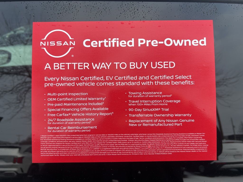 * 7 Year/100,000 Mile Limited Warranty, 24/7 Hour Roadside Assistance, Carfax Vehicle History Report, Plus 1 Year Pre-Paid Maintenance Included. Gas Powered Nissan Models Only.