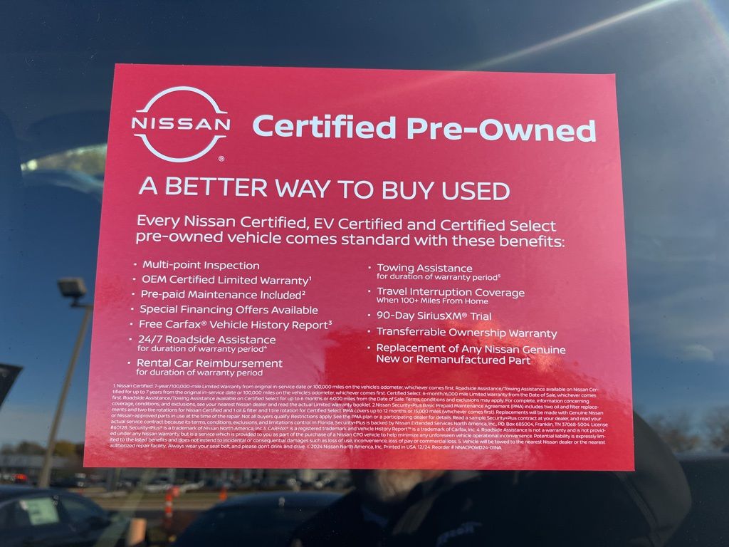 * 7 Year/100,000 Mile Limited Warranty, 24/7 Hour Roadside Assistance, Carfax Vehicle History Report, Plus 1 Year Pre-Paid Maintenance Included. Gas Powered Nissan Models Only.