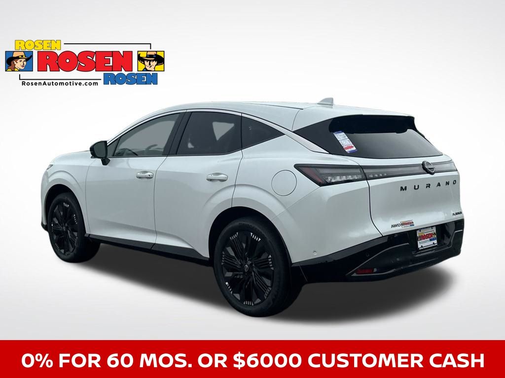 Here's why buying a new 2025 Nissan Murano Platinum AWD is a compelling choice: Compared to competitors, it delivers near-luxury interior and features for less than premium European/American midsize SUVs . Powerful & Efficient Drivetrain Equipped with a 2.0L VC Turbo 4cyl engine (241hp, 260lbft), replacing the older V6. Efficient 9speed automatic transmission, ditching the CVT for smoother, refined power delivery. EPA ratings: 21mpg city / 27mpg highway / 23mpg combined, with real-world tests confirming ~2223mpg Quick performance: 060mph in ~7.58.0s. Upscale & Comfortable Interior Zero Gravity seats front and rear reduce fatigue, with massaging, heated, and ventilated front chairs standard in Platinum. Dual 12.3inch digital displays, including Google-based infotainment, head up display, wireless Apple CarPlay/Android Auto. Premium ambiance: quilted semi-aniline leather, 64color ambient lighting, wood look dash, Bose audio High-Tech Safety & AWD All-wheel drive is standard on Platinum, offering reliable performance in varied conditions Features include Safety Shield360, ProPILOT Assist (with navigation based enhancements), 360 Around View Monitor with invisible hood mode. Awarded IIHS Top Safety Pick+ status, reflecting strong crash protection. Roominess & Utility Cargo space is generous: 32.9cuft behind rear seats, expanding to 63.5cuft with seats folded. Two-row layout offers better comfort than compact rivals, though rear legroom is average for the class. Towing capacity stands at 1,500lb, adequate for light trailers or boats. Highlights at a Glance Feature Benefit VC Turbo engine + 9speed auto Refined performance with smooth shifts AWD standard Confidence in bad weather or light off-road Zero Gravity seats + massage Long-distance comfort rivaling luxury SUVs Dual 12.3 screens + Bose + HUD Tech-rich and premium ambiance Advanced safety Top-tier crash ratings and driver assists Who Its Best For Buyers seeking a luxurious ride without luxury price tag, filled with comfort and tech. Those who prioritize driver assistance, safety, and AWD capability. Families needing ample cargo space without moving up to a three-row SUV. Enthusiasts who want modern performance and refinement without the drawbacks of a CVT., 9-Speed Automatic, AWD. 21/27 City/Highway MPG 2025 Nissan Murano Platinum, 9-Speed Automatic, AWD. 21/27 City/Highway MPG 2025 Nissan Murano Platinum